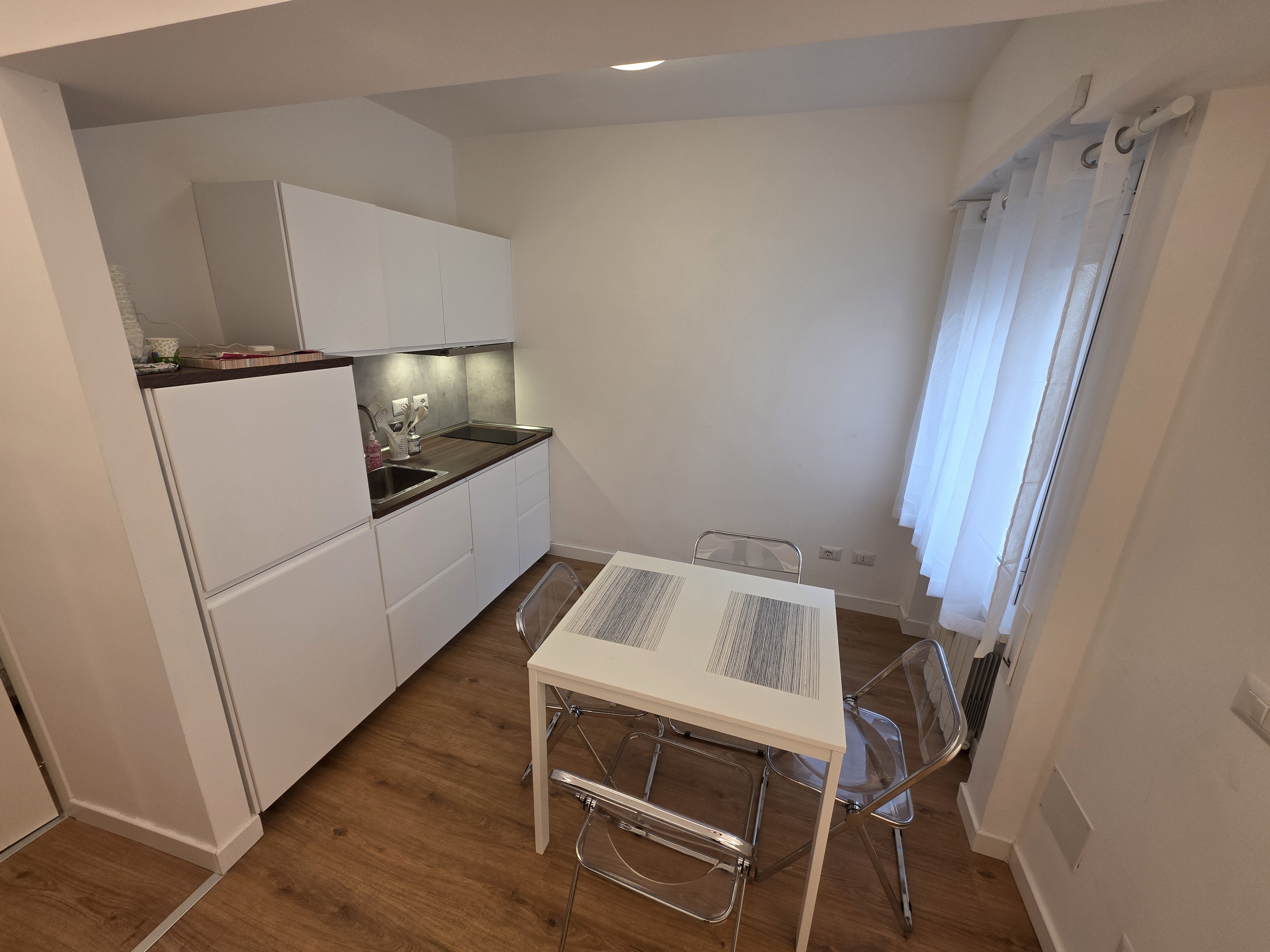 Composta da monoblocco con fornelli ad induzione, un lavabo, lavastoviglie, frigo, microonde, accessoriata con pentole, piatti, posate e bicchieri.