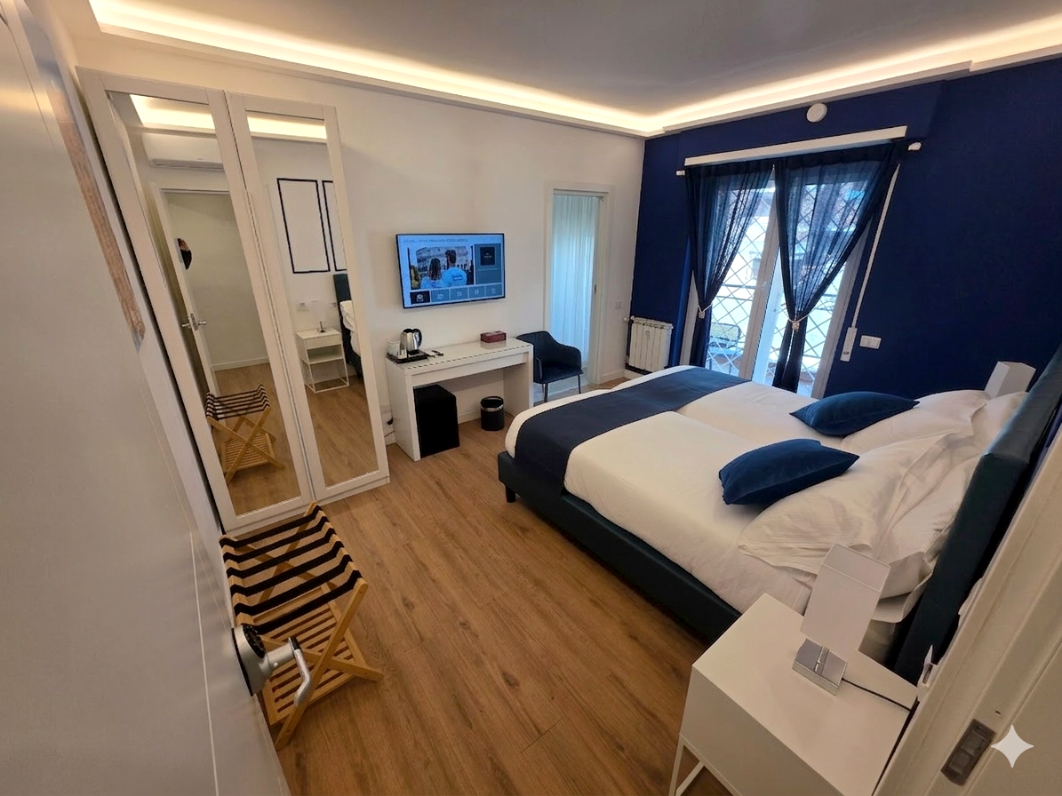 La camera doppia o twin è dotata di armadio, scrivania, letto matrimoniale o due letti singoli, climatizzatore autonomo, balcone. Smart tv, KIT bollitore e frigo bar, luci regolabili, attacchi caricatori da parete e scrivania, WIFI, bagno con doccia, servizi, phon asciugacapelli, kit di cortesia.