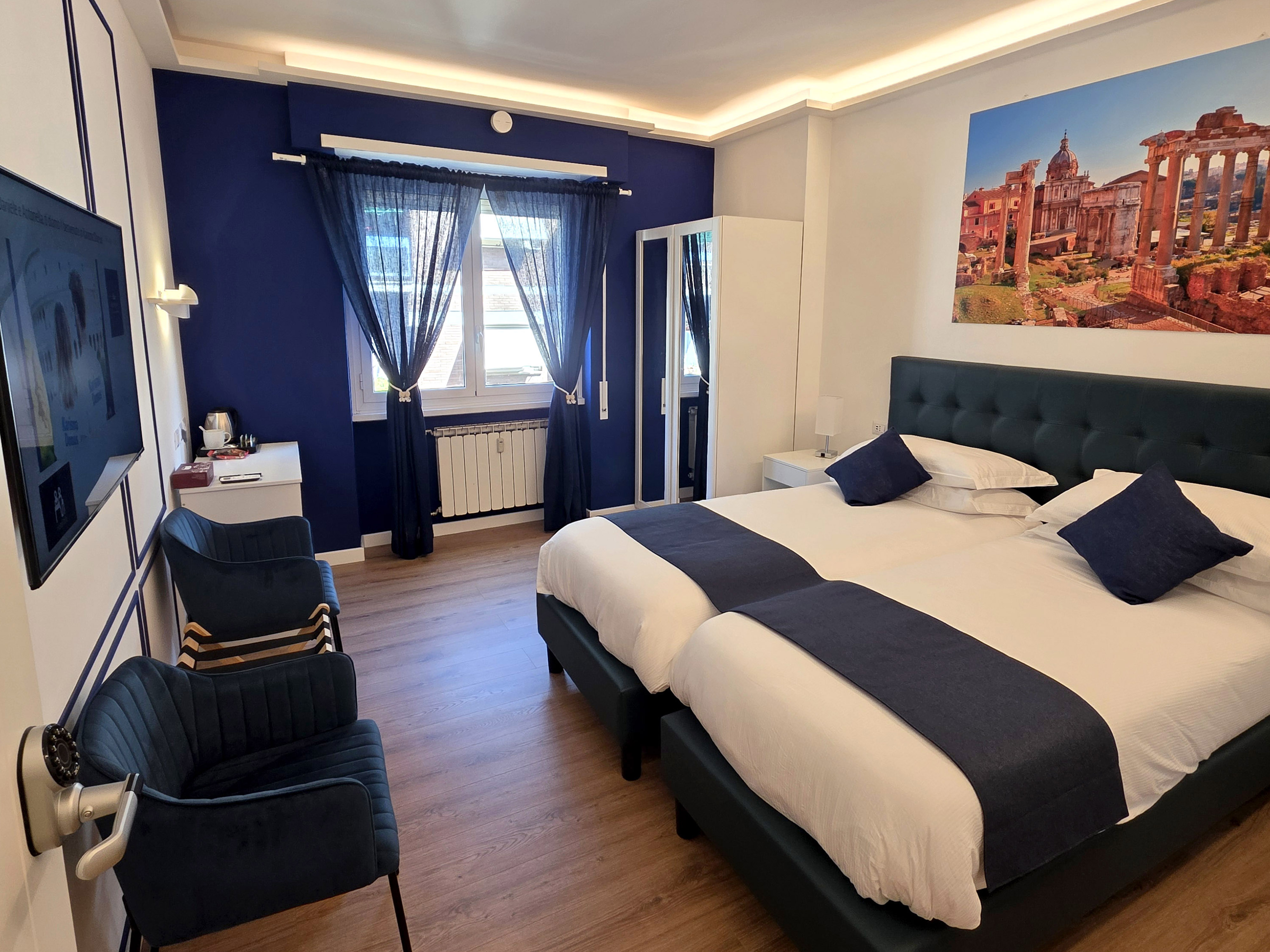 La camera doppia o twin è dotata di armadio, scrivania, letto matrimoniale o due letti singoli, climatizzatore autonomo. Smart tv, KIT bollitore e frigo bar, luci regolabili, attacchi caricatori da parete e scrivania, WIFI, bagno con doccia, servizi, phon asciugacapelli, kit di cortesia.